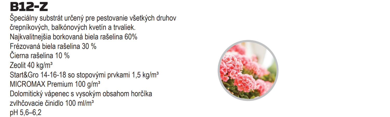 Špeciálny substrát určený pre pestovanie všetkých druhov izbových kvetín, letničiek a balkónoviek v kvetináčoch strednej veľkosti. Zvlášť je vhodný pre pestovanie všetkých druhov pelargónie a tiež listnatých kríkov